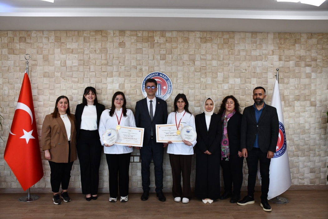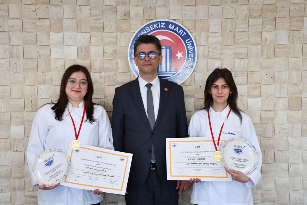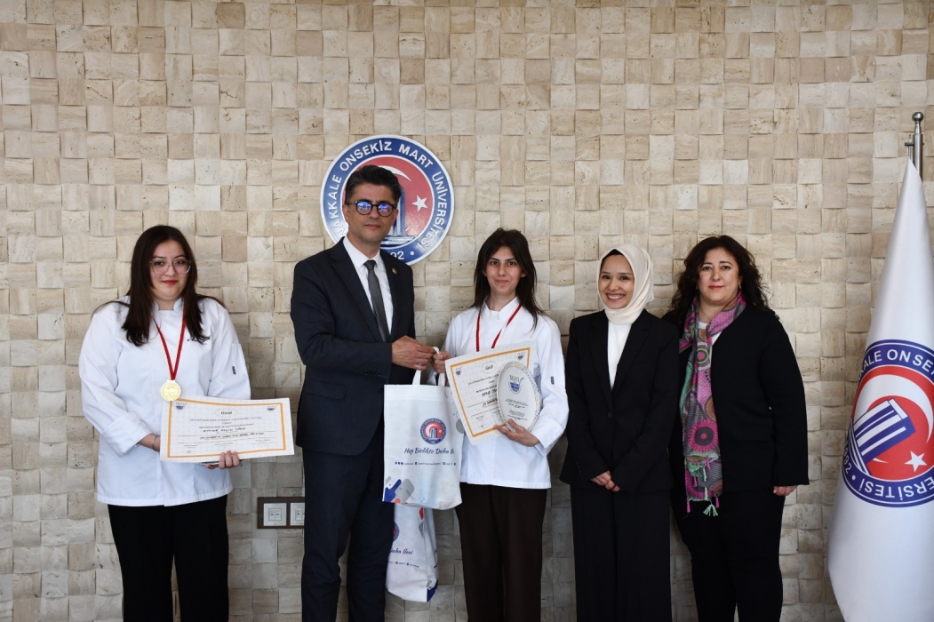 Çanakkale Onsekiz Mart Üniversitesi Rektörü Prof. Dr. Cüneyt Erenoğlu, 22. Uluslararası TAŞFED Gastronomi Festivali’nde altın madalya kazanan Gökçeada Meslek Yüksekokulu Turizm ve Otel İşletmeciliği programı öğrencileri Emine Elçin Uğur ve Merve Güvercin’i makamında kabul ederek ödüllerini takdim etti.